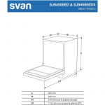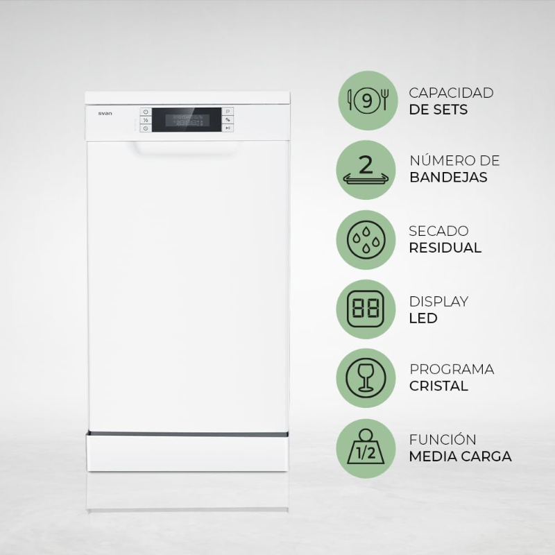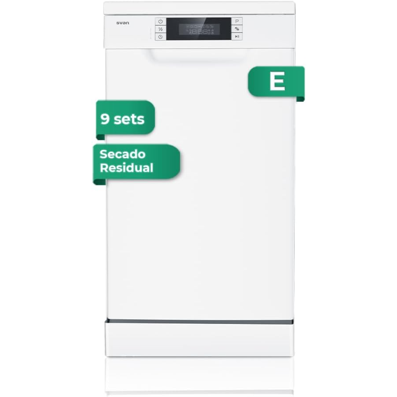 Lavavajillas Svan tiene capacidad para 9 a 12 cubiertos. Funciona con un consumo de energía de clase A+, con un ciclo de lavado de hasta 158 kWh al año. El consumo de agua es de 10 litros por ciclo en modo estándar. Dispone de 6 programas de lavado que incluyen intensivo, normal y rápido, y un funcionamiento con un nivel de ruido de 49 dB. Tiene un panel de control con display LED y botones táctiles para seleccionar programas y funciones. Incluye cesto superior ajustable y espacio para utensilios en la parte inferior. Es compatible con tabletas y detergentes líquidos. La instalación debe realizarse en un espacio adecuado, respetando las indicaciones del fabricante para conexiones de agua y electricidad.